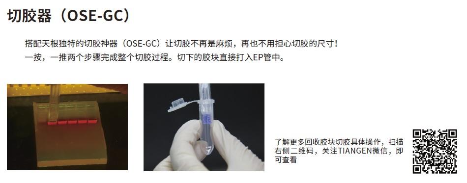 切胶器(OSE-GC) 搭配天根独特的切胶神器 (OSE-GC) 让切胶不再是麻烦,再也不用担心切胶的尺寸! 一按,一推两个步骤完成整个切胶过程。切下的胶块直接打入 EP 管中。