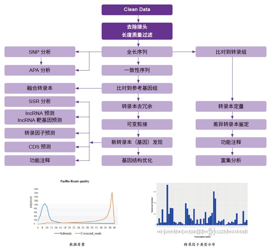 全长转录组是指基于 PacBio/Nanopore 三代测序平台,对物种全长 mRNA 进行测序研究。无需打断,直接读取反转录的全长 cDNA,从而有效获取高质量的单个 RNA 分子全部序列。相比基于二代测序的普通转录组,全长转录组在识别转录本同源异构体、检测可变剪切、同源基因等转录本结构相关问题上有巨大优势,是研究生物体功能的重要途径。