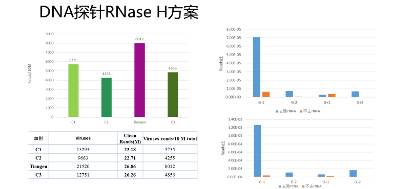 为了在有限的测序数据中明确真实病原的类型,针对宿主细胞较多的样本去除宿主核酸以提升病原检出的灵敏度是非常必要的,否则容易造成微量病原核酸难以检出,甚至假阴性的结果。天根rRNA去除方案能够有效提升RNA病原的检出Reads数。
