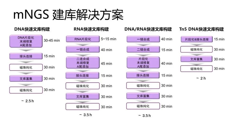随着病原mNGS检测的时效性需求不断提升,天根生化针对不同建库策略,进行了多步反应体系和Buffer的优化,实现了多步反应一管进行,减少了文库构建过程中的磁珠纯化步骤,仅需2小时就可完成文库构建,用户可以根据检测的实际需求选择合适的文库构建策略。
