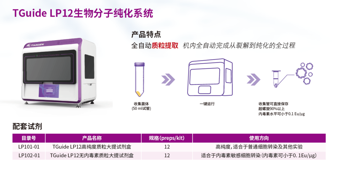 TGuide LP12基于磁珠法原理提取核酸,搭配单通道移液枪和12通道移液枪,全自动完成从菌体沉淀上机后的质粒提取流程,一体机运行中途无需人工介入,提取产物自动存储于1.5/2.0 ml收集管中,收集管可直接保存,超螺旋90%以上,内毒素水平可小于0.1EU/μg。