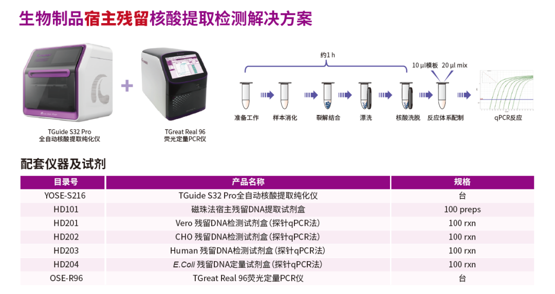 配套TGuide S32 Pro全自动核酸提取纯化仪和TGreat Real 96荧光定量PCR仪,实现对宿主核酸残留的精准检测,为生物制药企业在工艺研究和成品控制提供强有力的技术保障。