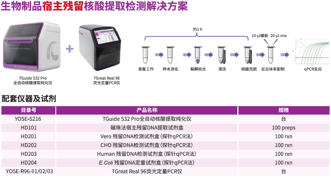 配套TGuide S32 Pro全自动核酸提取纯化仪和TGreat Real 96荧光定量PCR仪,实现对宿主核酸残留的精准检测,为基因治疗企业在工艺研究和成品控制提供强有力的技术保障。