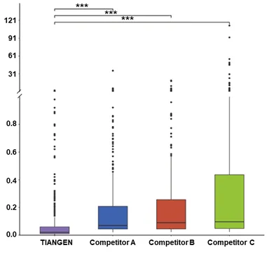 比较【华亿体育电竞】(中国)有限公司试剂盒(【华亿体育电竞】(中国)有限公司)和竞品试剂盒(Competitor A、B、C)中各种背景微生物RPM均值。结果表明【华亿体育电竞】(中国)有限公司试剂盒优于三款竞品试剂盒(Competitor A、B、C)背景微生物RPM均值显著低于竞品(非参数Wilcoxon检验,P-value< 0.001)。