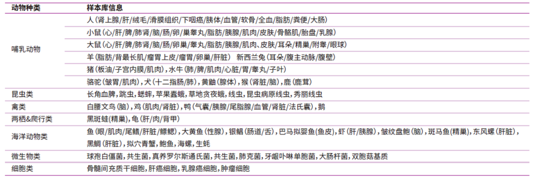 已验证的动物组织及微生物种类超150种: