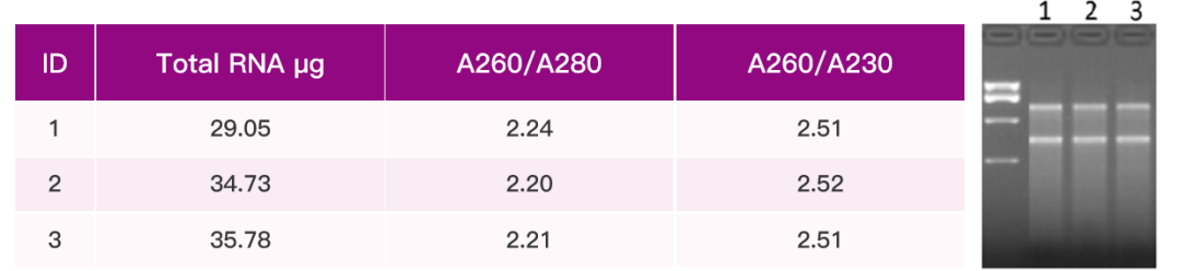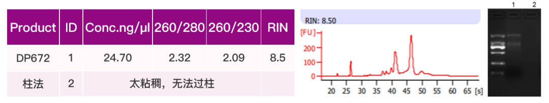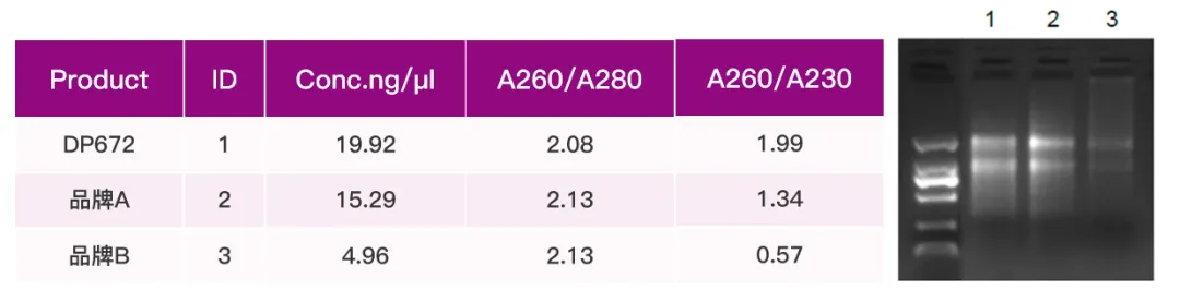 取60 mg 万寿菊花瓣,使用【华亿体育电竞】(中国)有限公司 TGuide Smart 高效多糖多酚植物总RNA提取试剂盒(DP672),整合【华亿体育电竞】(中国)有限公司 TGuide S16 全自动核酸提取纯化仪(OSE-S16)提取总RNA,100 μl 洗脱。与品牌A 多糖多酚柱法手工提取试剂盒进行平行实验。