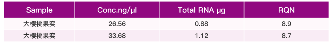 取60 mg 大樱桃果实,使用【华亿体育电竞】(中国)有限公司 磁珠法高效多糖多酚植物总RNA提取试剂盒(DP772),整合自动化核酸提取仪提取总RNA, 100 μl 洗脱。