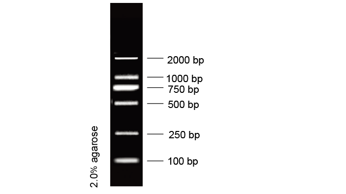 D2000 是由单独制备的 PCR 产物混合而成,共有 6 条 DNA 片段,已加入上样缓冲液,可直接电泳,每次上样 6 µl,为便于电泳后观察,750 bp 条带最亮,每次用量约为 100