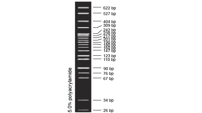pBR322 DNA/MspI 是由 pBR322 质粒 DNA 经 MspI 酶切并经加热灭活的产物。已加入上样缓冲液,可直接电泳,每次上样 5 µl(浓度为 0.1 µg/µl)。