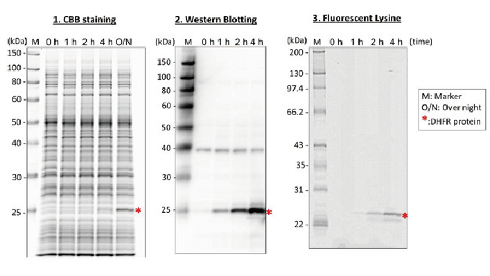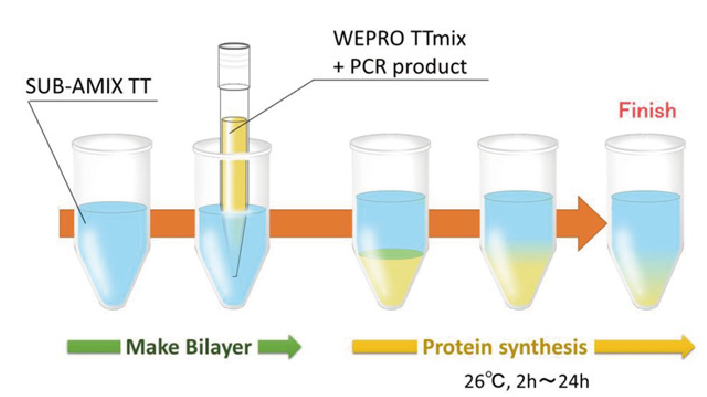 mix,mix 中包含蛋白转录、翻译的所有必需酶类、tRNA 和离子环境,只需加入 DNA 模板即可一步完成蛋白的转录和翻译,直接获取目的蛋白。此外,试剂盒中还包括线性模板构建所需 PCR 引物,以及 pEU-E01-DHFR 质粒作为阳性对照,另提供带有荧光标记的赖氨酸 -tRNA,用以标记合成蛋白,便于观测。本试剂盒利用双层液相反应法(Bilayer)表达目的蛋白,只需 1-4 小时即可观察到目的蛋白,每个反应蛋白表达量为 1-3 µg,除了可以应用于 Western 蛋白检测实验之外,还可作为模板测试试剂,快速检测目的质粒或片段能否成功表达目的蛋白。能够在本试剂盒表达成功的模板质粒或片段,可直接应用于 CFS 系列其他试剂盒中,做大量蛋白表达使用。